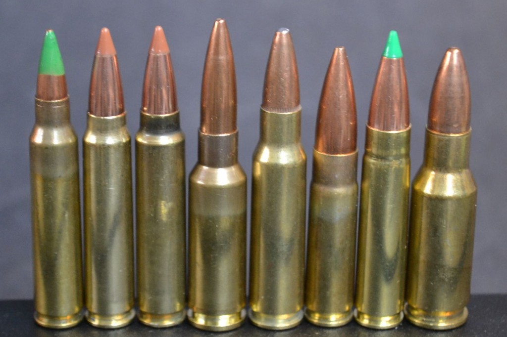 AR-15/M16 cartridge line up (left to right): 223 Remington/5.56mm NATO, 6.5 PCC virgin brass, 6.5 PCC fire formed brass, 6.5 Grendel, 6.8 SPC, 300 AAC BLK, 7.62×40 WT and 30AR.