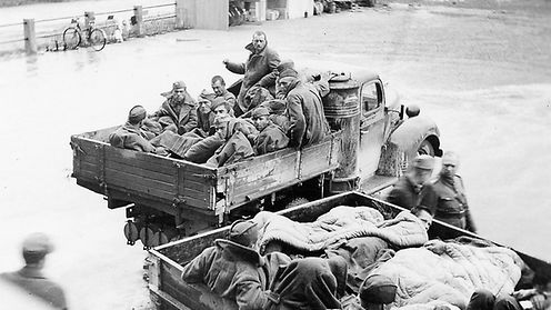 Sotilaita, todennäköisesti venäläisiä sotavankeja, kuorma-autojen lavalla. Eeva Vahvaselän kotialbumi.