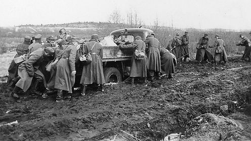 Sotilaita yrittämässä irrottaa mutaan juuttunutta autoa jatkosodan aikana. Toivo Salmen kotiarkisto.MTV Uutiset