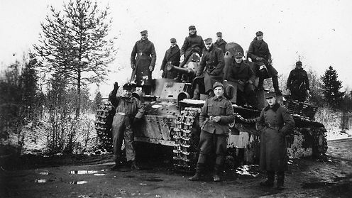 – Tämä kuva, jossa poseerataan panssarivaunun ympärillä, on jokseenkin poikkeava niistä monista potreteista, joita sota-ajalta tavallisesti nähdään.