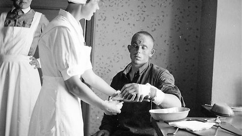 Eeva Vahvaselän äiti sitomassa sotilaan kättä sotasairaalassa.