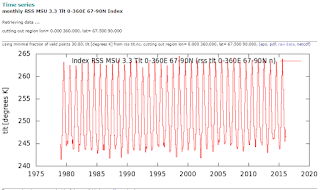 Hmm… Kävin tarkistamassa satelliittihavaintoihin perustuvasta hyvin arvostetusta ja tarkasta RSS-aikasarjasta alemman troposfäärin kuukausittaiset lämpötilat. Viime helmikuu oli toki lämpimin tuossa helmikuiden sarjassa – 0,85 astetta vuosien 1979-2016 keskiarvoa korkeampi, mutta sarjasta löysin 237 lämpimämpää kuukautta. Ennätyslämmintä oli vuoden 1998 El Nino –vuoden heinäkuussa, joka oli 2,4 astetta viime helmikuuta lämpimämpi. Siis mikä lämpöraja rikottiin, ja mitä sillä oli tekemistä Pariisin kokouksen kanssa?