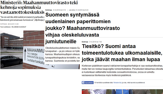 Ylen pääuutinen (31.8.2016) kertoi, että kielteisen turvapaikkapäätöksen saaneelle irakilaiselle kuuluu toimeentulotuki, jos hän kieltäytyy palaamasta kotiinsa. Kaikki eivät ole toimineet perustuslain mukaisesti ja jotkut kunnat ovat kieltäytyneet maksamasta toimeentulotukea oleskeluluvattomille ulkomaalaisille. Uutisen avulla kunnat saadaan ruotuun ja samalla kaikkialle maailmaan tiedoksi, millainen hölmölä Suomi on.