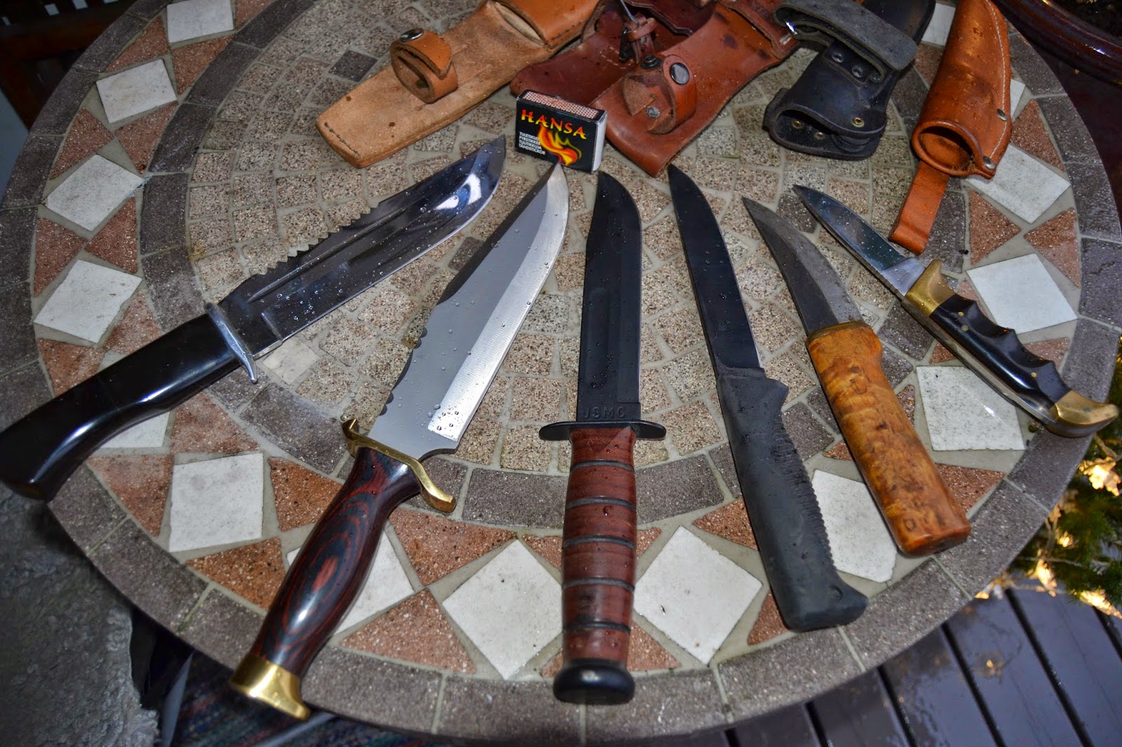 Itsellä oli lahjaksi saatu KA-Bar, jolle en löytänyt oikein käyttöä, suomalainen lapin puukko ja Glockin taisteluveitsi. Molemmat jälkimmäiset tuntuivat päteviltä, mutta en nyt päässyt nitä keneenkään kokeilemaan... Gerber Multitool oli paljon hyödyllisempi, tykkään enemmän kuin Leathermanista.