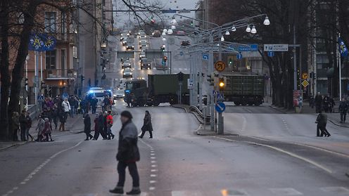 Poliisilla erittäin tiukat turvatoimet Turussa Joulurauhan julistamisen yhteydessä 24. joulukuuta 2016. Viranomaiset katkaisivat puolustusvoimien ajoneuvoilla liikenteen.Lehtikuva