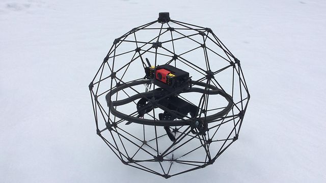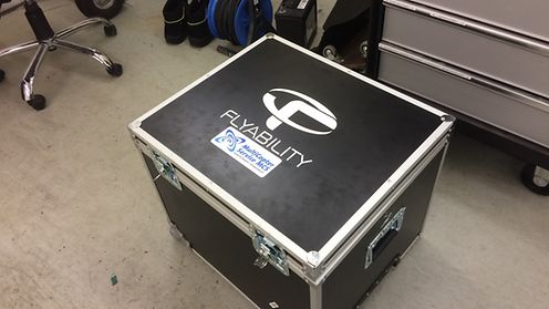 Kopteri on merkiltään Elios. Se oli pakattu mustaan laatikkoon, jonka kulma on vahvistettu alumiinilistoilla. Laatikossa lukee Flyability.