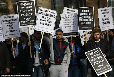 Muslimit protestoivat Charlie Hebdoa terroriteon jälkeen. Paavi oli niin ystävällinen, että antoi siunauksen väkivallalle reaktiona. Yhdessä kyltissä sitaatti paavilta: "Loukkaa äitiäni ja vedän sinua turpaan."