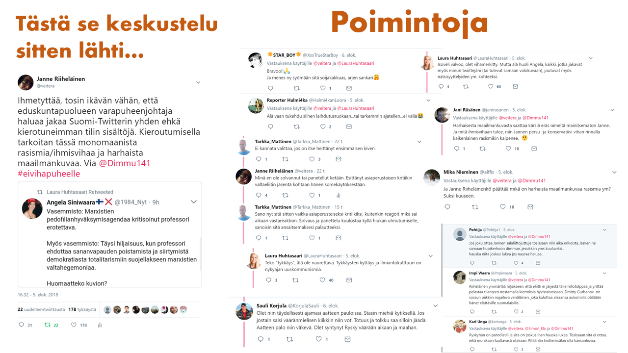Siinä rinnastettiin Jyväskylän yliopiston professorin Tapio Puolimatkan puheenvuoro siitä, miten hänen mielestään pedofiliasta pyritään tekemään hyväksyttävää, professori Heikki Hiilamon puheenvuoroon siitä, miten sosiaalisen median vihanlietsonta ja valheet ovat vahingollisia.